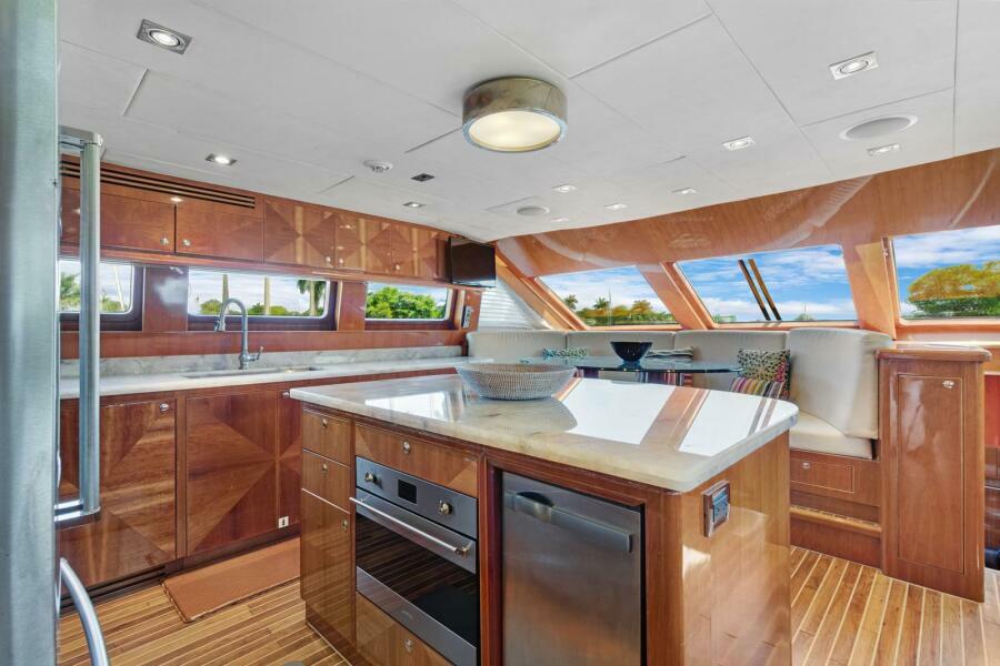 With eleven windows the area is very light and airy. The appliances are both port and starboard with an island in the center with ample storage below.