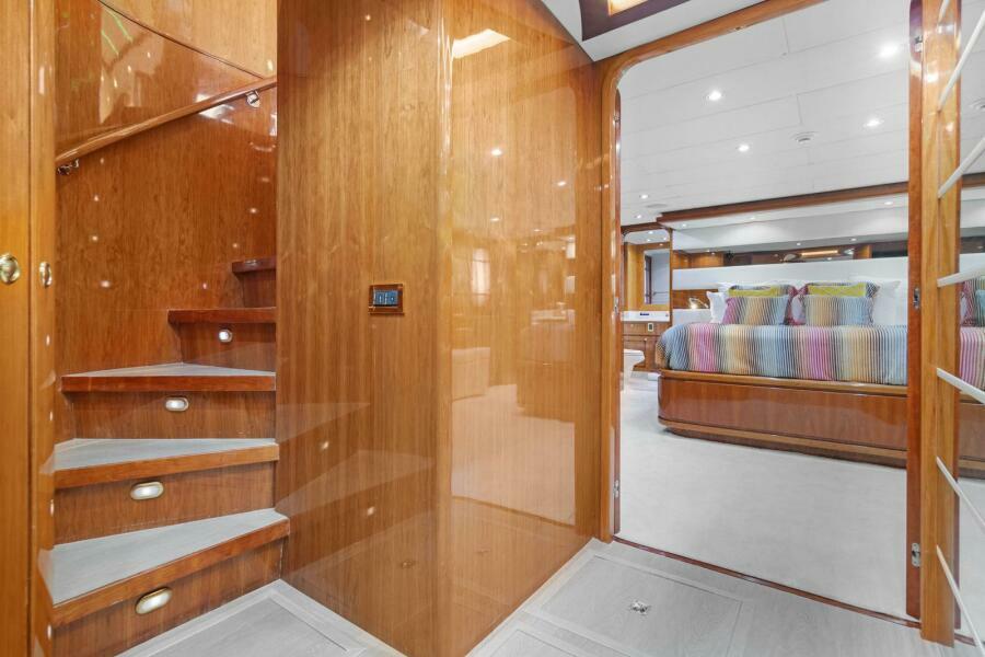 Two crew cabins and one head are forward. The main accommodation steps lead to a large Master Cabin aft with His and Hers Heads separated by a separate head and shower.