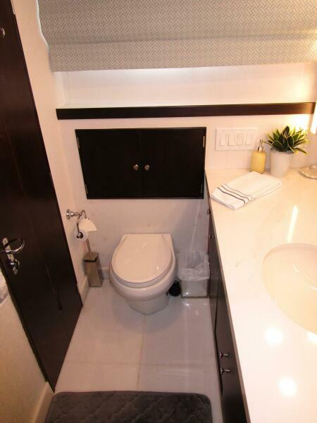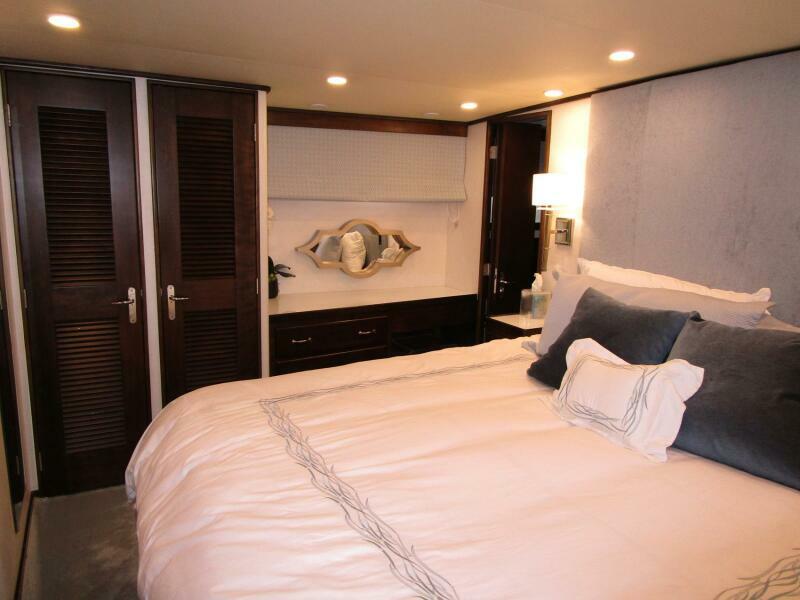 Below decks the king size Master suite with separate His and Hers Heads is aft, the port side having a shower to starboard a Jacuzzi tub.