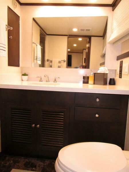 Stairs forward lead to the engine room and the crew area. To port is a double berth ensuite Captain’s cabin and forward is a two bunk ensuite Crew cabin. Also in this area is a separate washer dryer.