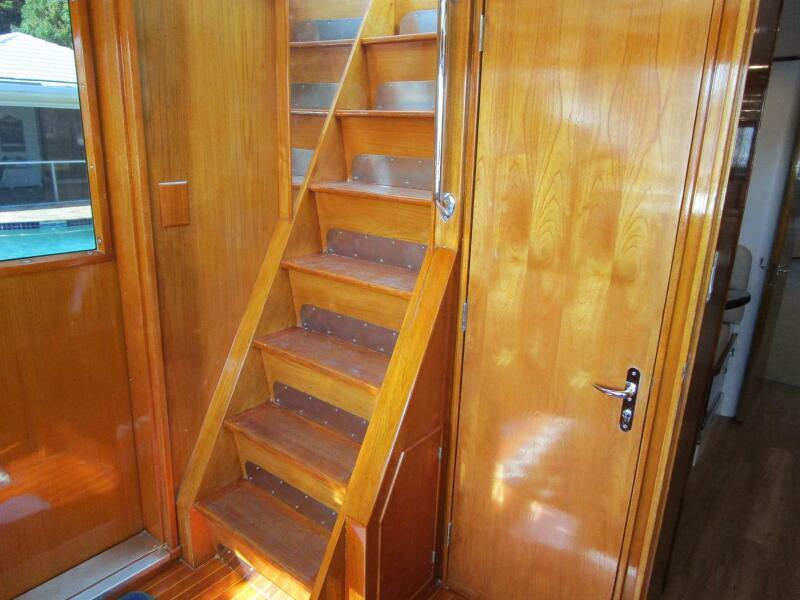Aft are steps to the Flybridge and a slim storage locker. Forward to starboard are steps to the engine room and crew cabins.