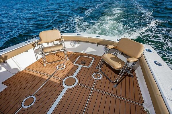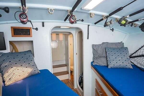 As you step below, the first door to port opens to a private head with a vanity and sink. Forward of the head is a separate, dedicated stall shower. The galley is positioned to starboard and features ample storage, including both above- and below-counter drawers and lockers, as well as a stainless-steel sink. The large forward V-berth offers comfortable bunks and drawer storage for two. All lighting and outlets are both 110V and 12V. The interior is beautifully trimmed in teak hardwood, and all soft goods are tastefully finished to complement the Classic Carolina style.
