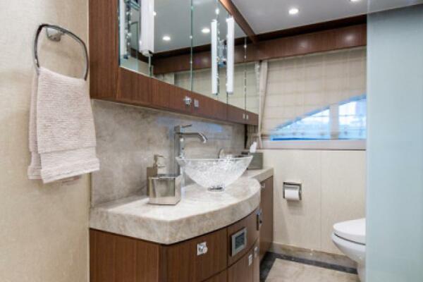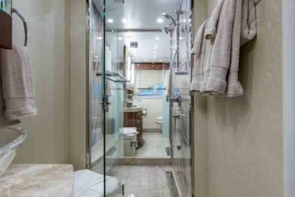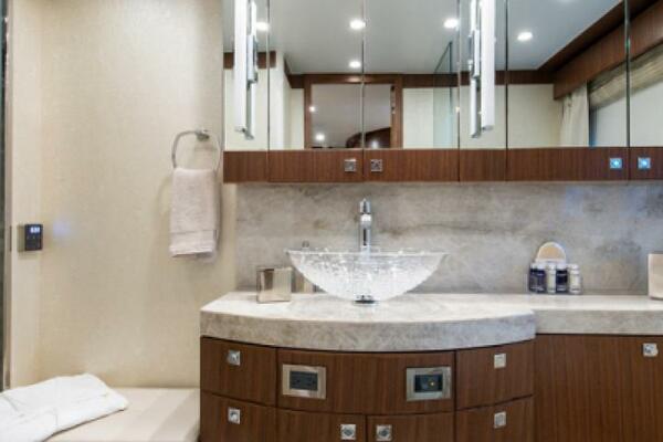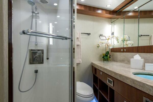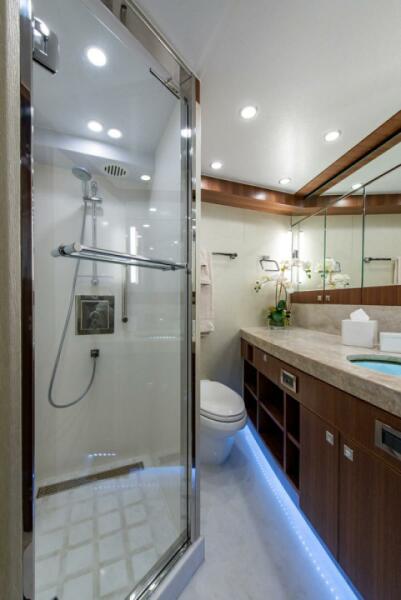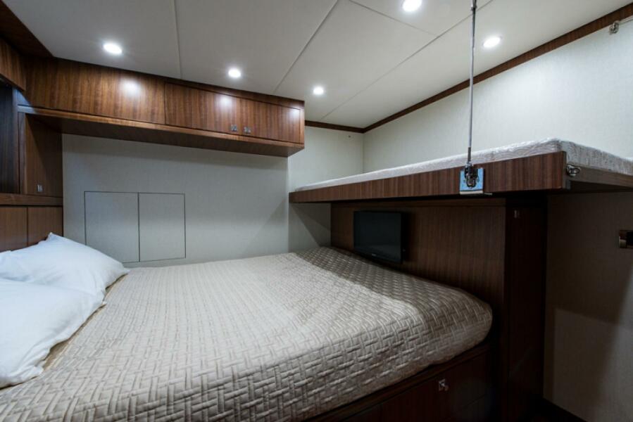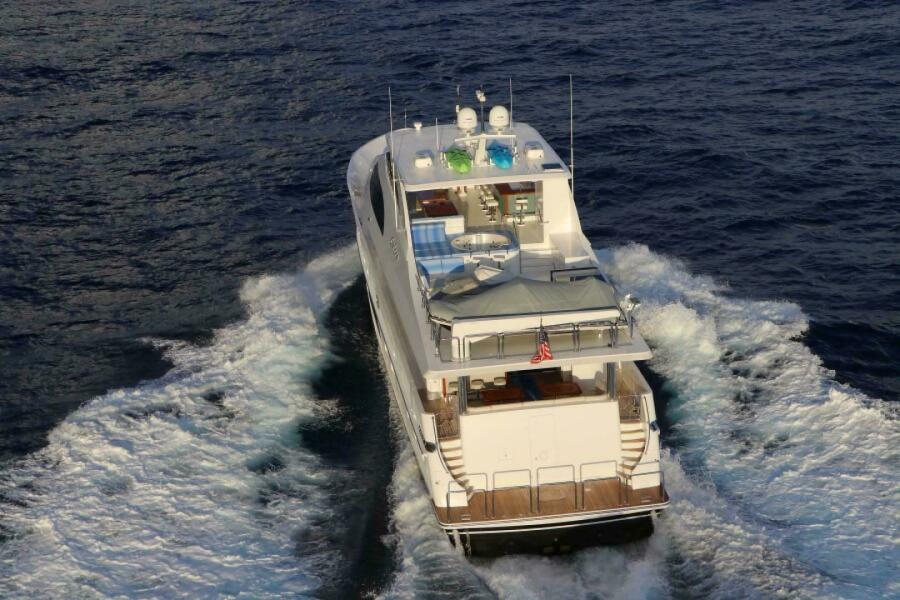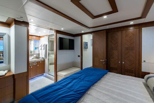 The popular raised pilothouse design offers magnificent accommodations with five staterooms, including a full beam master stateroom, two full-beam VIP suites, a day head in the salon, and an additional day head conveniently located on the flybridge deck.