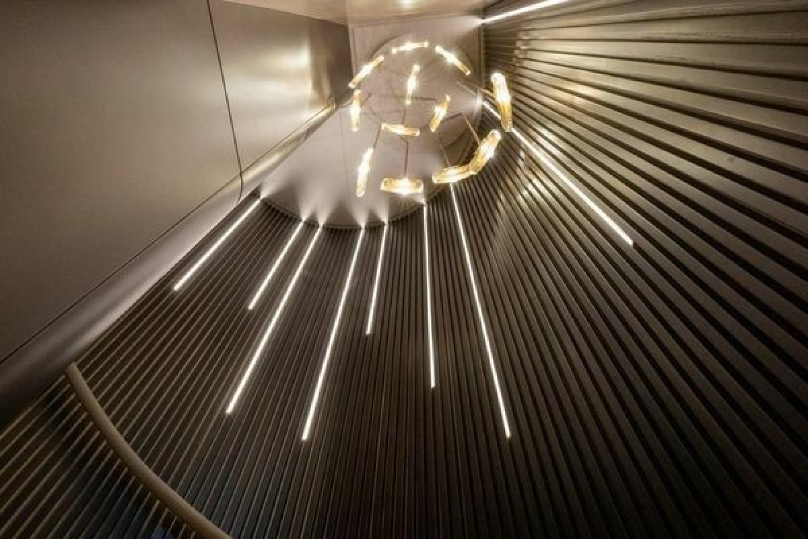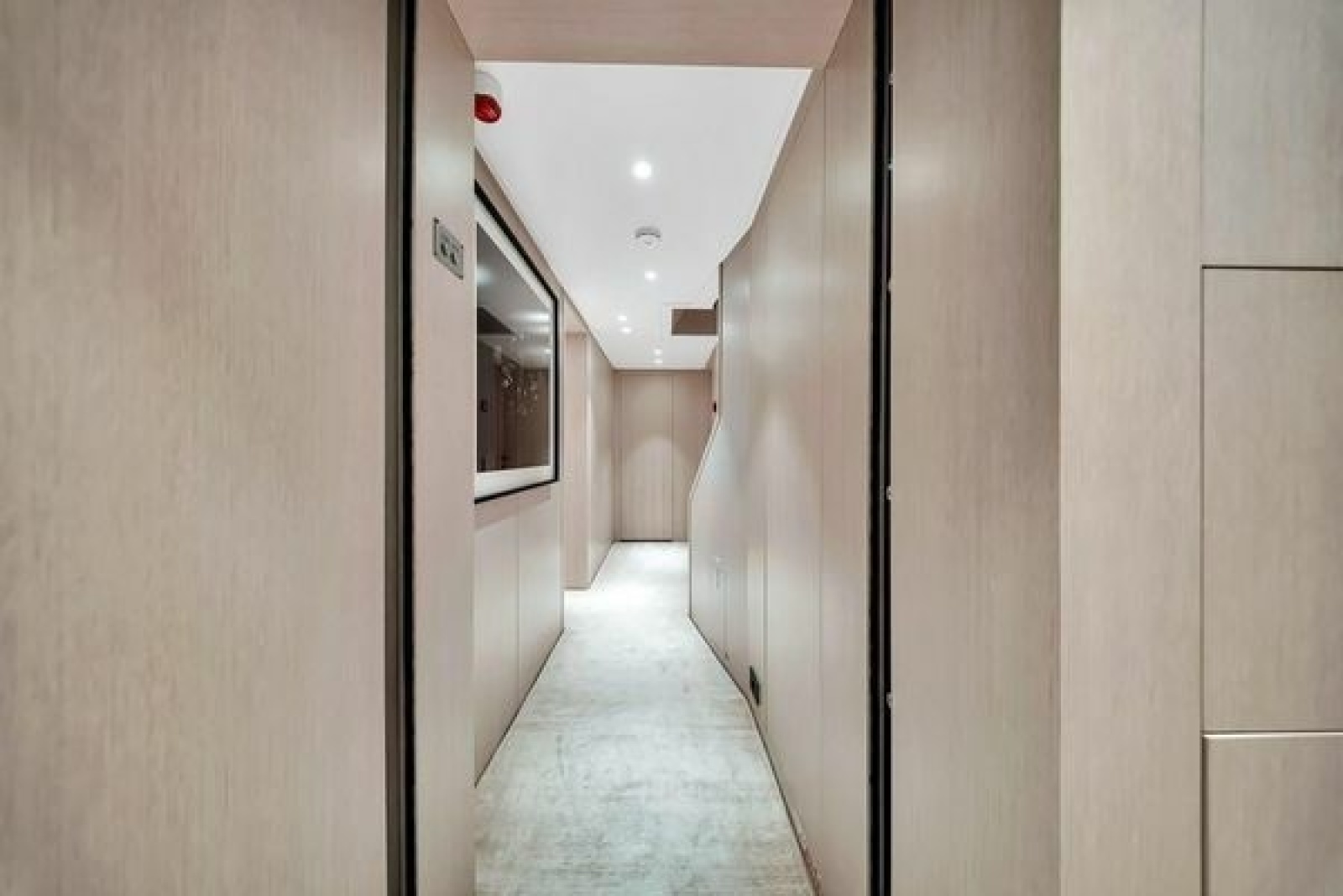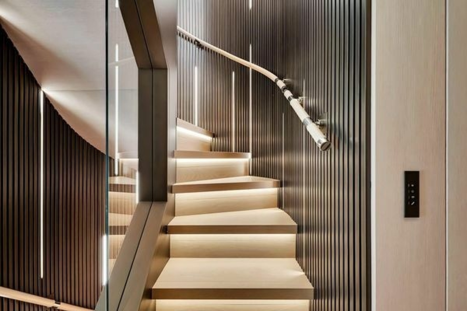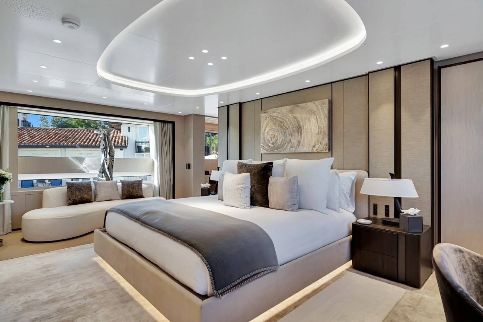 The sky lounge, accessible via both the exterior decks and a striking central staircase, serves as one of the yacht’s key social hubs. The staircase itself is a design statement, finished in bronze with integrated LED detailing and crowned by a bespoke chandelier by Paolo Castelli. Inside, floor-to-ceiling windows and opening side sliding glass doors create a strong connection to the surrounding seascape. Furnished throughout by Minotti, the lounge is arranged in a sophisticated, theatre-style configuration complemented by a fully equipped backlit Onyx service bar.