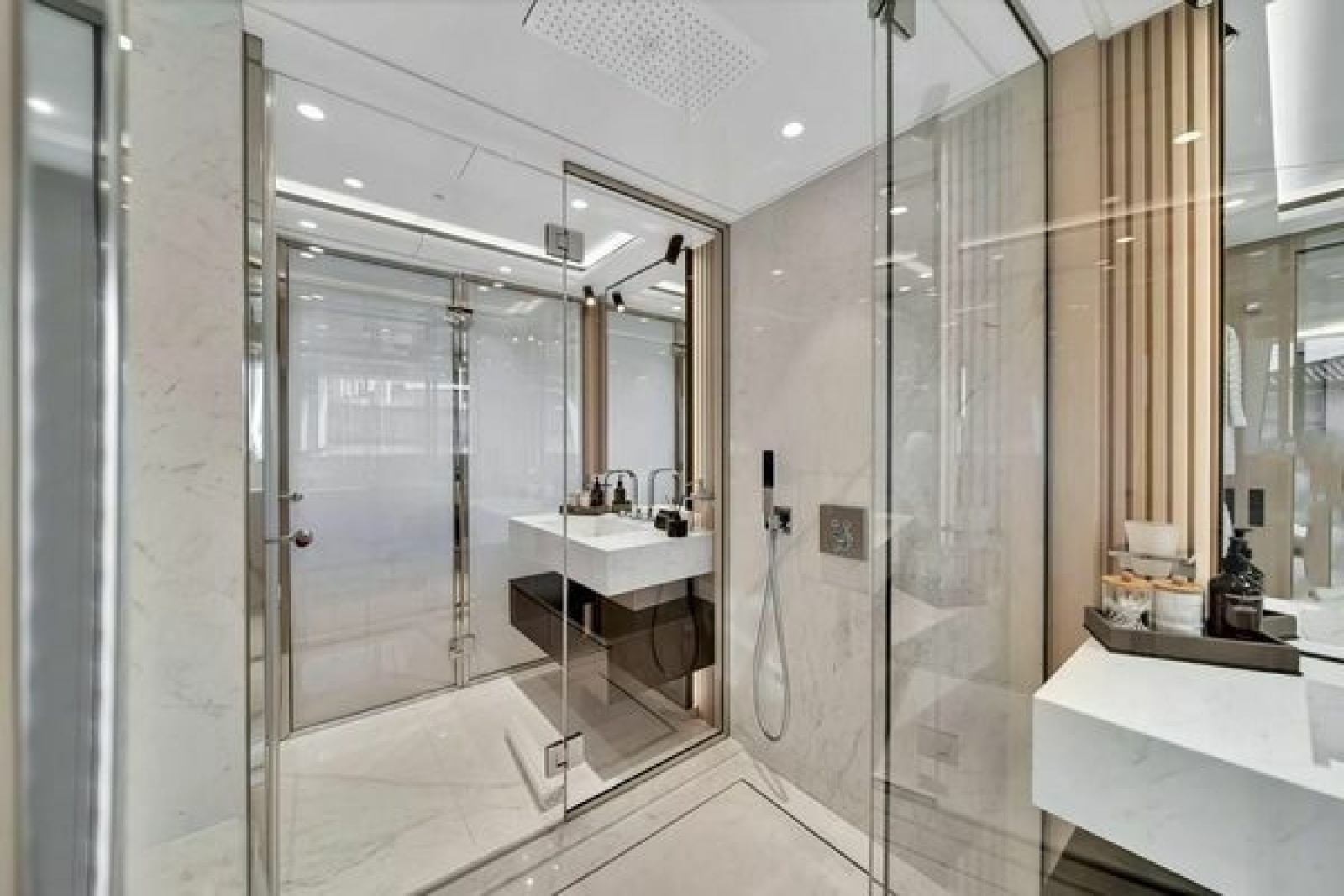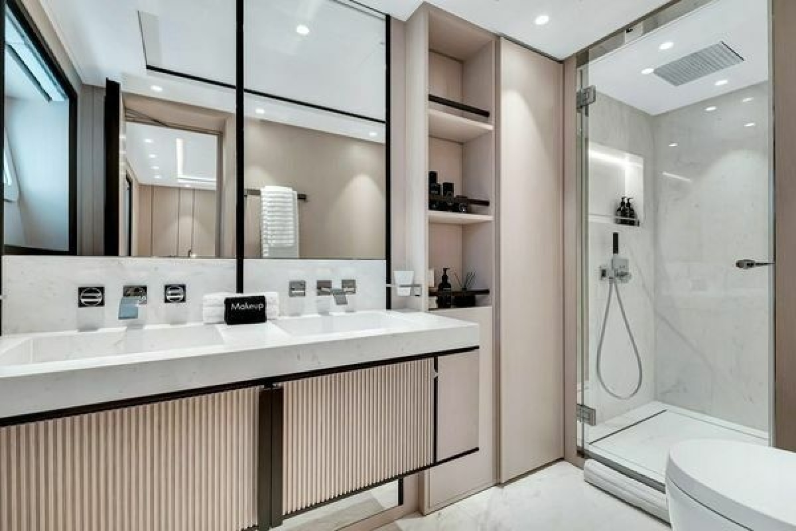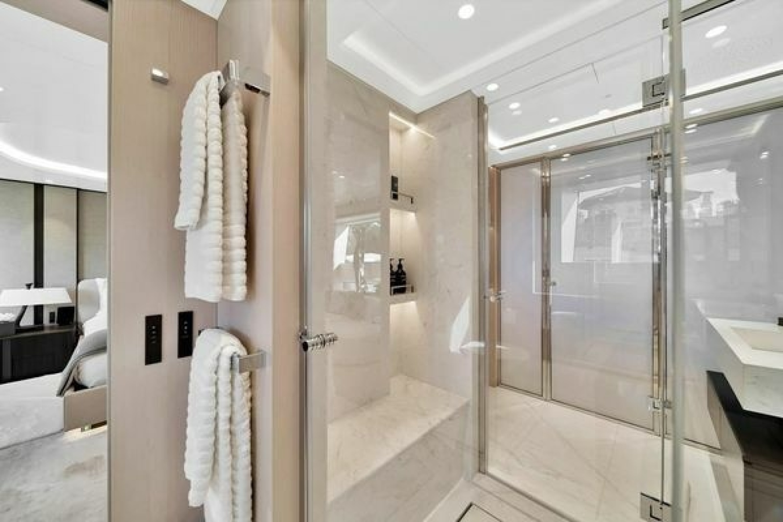 Luxury bathrooms with marble, Corian, or veneer finishes and glass shower enclosures