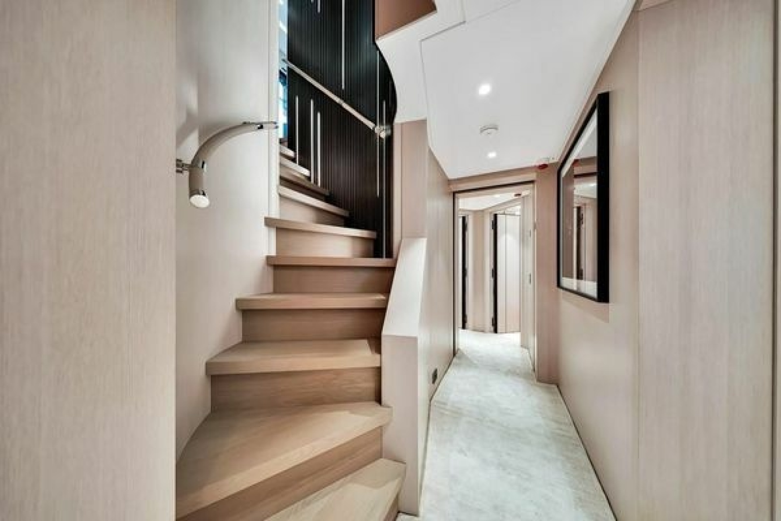 Glass-protected stairways lead to the sundeck, where guests will find the second pool, finished in elegant mosaic and designed to accommodate up to 10 guests. A forward aft sunbathing area enhances the usability of the space, creating a balanced environment for both relaxation and entertainment.