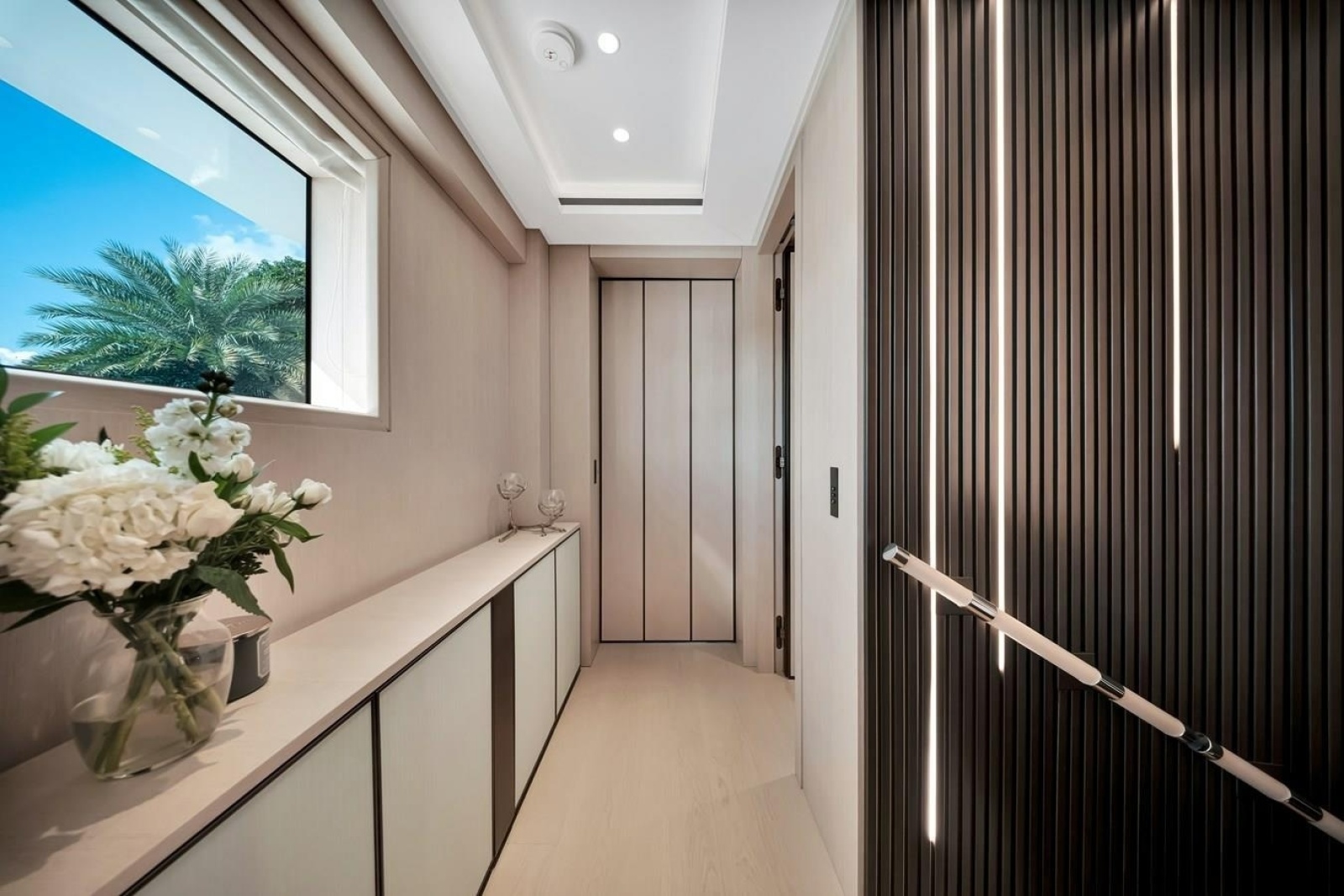 Entering the main salon through fully retractable glass doors, the interior reveals a remarkable sense of space—more commonly found on significantly larger yachts. The layout is elegantly arranged with a spacious lounge and formal dining area, subtly divided by a refined central feature that enhances both functionality and visual flow.