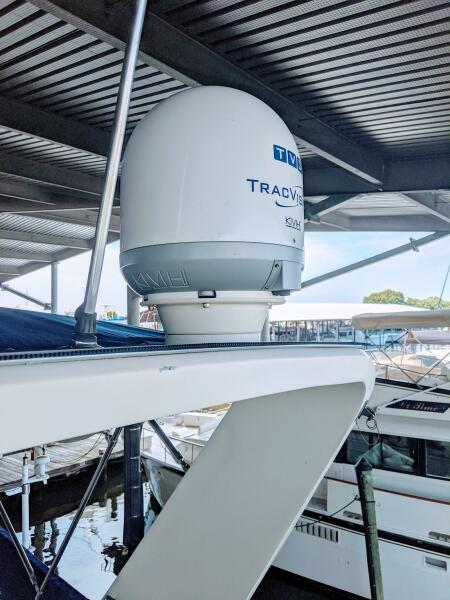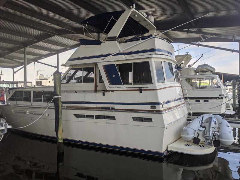 Beautifully maintained 46 Chris Craft Constellation is a tremendous motoryacht for extended periods on the water. She has generous living space with good handling characteristics, with lots of extra equipment. GREAT LOOP FRIENDLY! The arch is hinged to lower.
