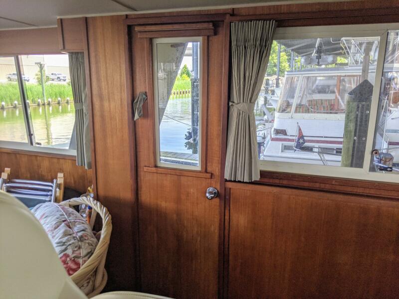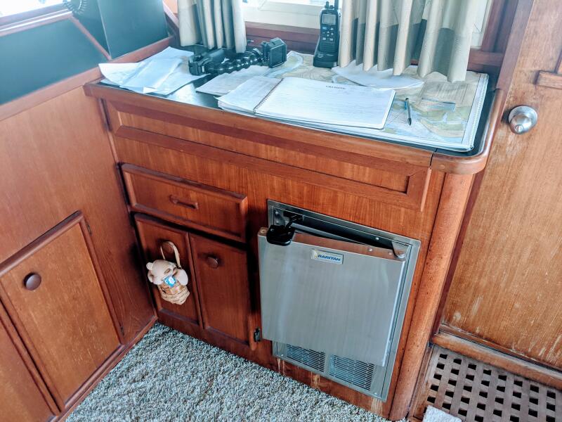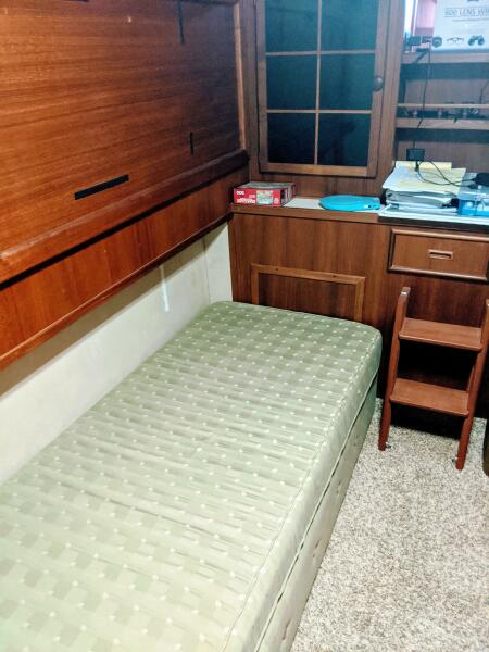 Access to the flybridge is gained by a ladder in upper salon. Down four steps to port is the main salon. Down three steps aft from the main salon is an office/third stateroom to starboard. The master/guest head is to port with a proper stall shower. Master stateroom is aft and full beam. Queen centerline berth with drawers located on either side. Just forward of the salon on the port side you will find the built-in "L shaped" dinette. The galley is immediately to starboard (down two steps). The forward stateroom has two oversized berths (upper/lower bunks) with head/shower in the forepeak.
