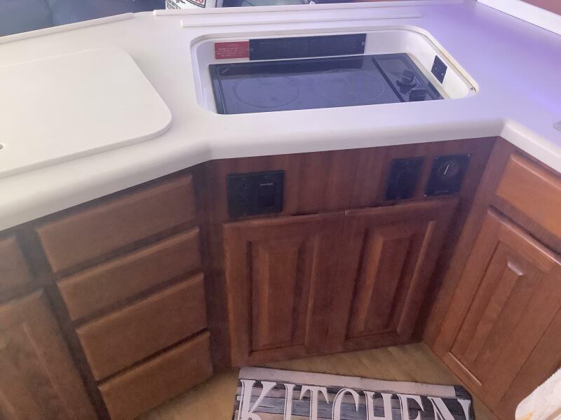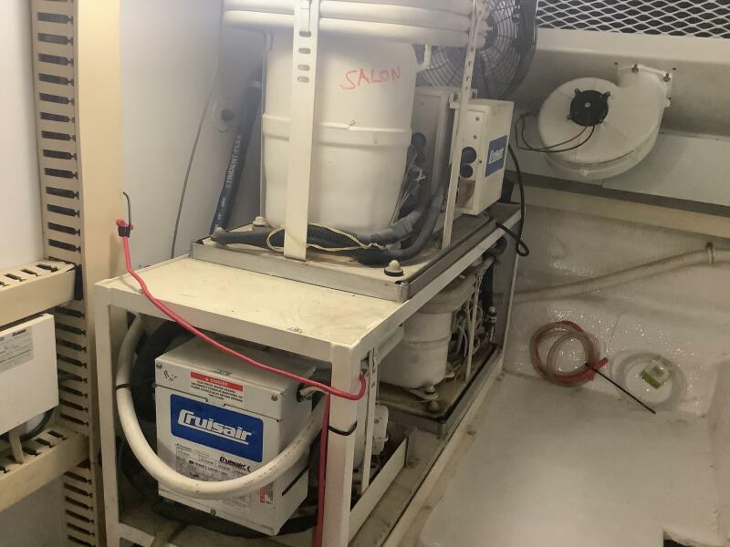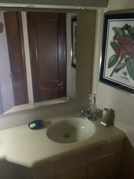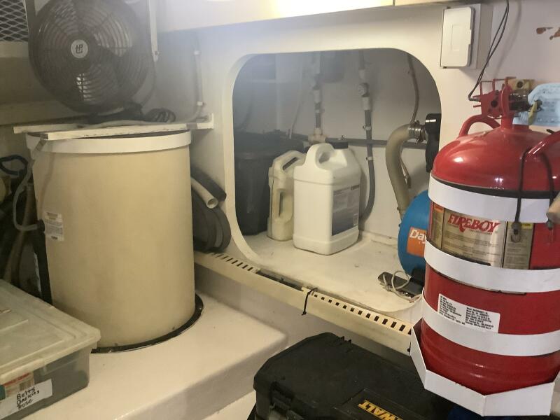 Great cockpit of 144 square feet with fiberglass, nonskid sole and transom door. Lift out fish box with macerator, storage hatches. Tackle center with bait freezer, bait well and sink to port. Direct access to the engine room on centerline. Custom made cockpit cover for the flybridge to the transom with shock cord and pins system.