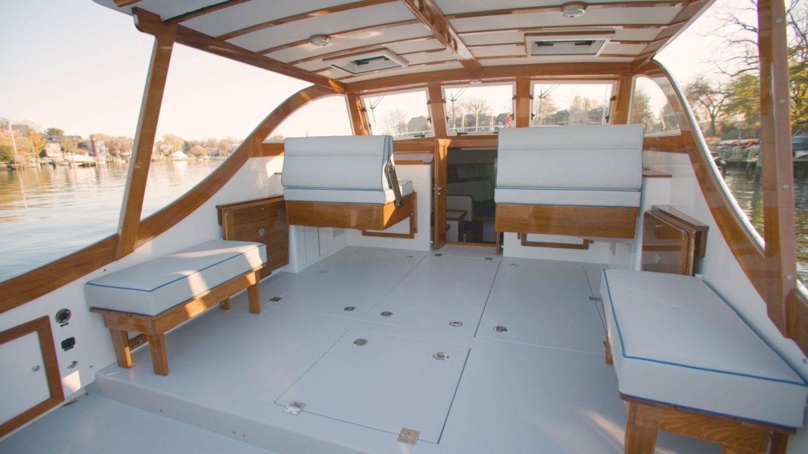 The cockpit and shelter are designed for real use. With wide open working space, excellent visibility, and thoughtful details everywhere you look. Teak tables, varnished seating, and a warm, understated finish create an inviting space whether you’re hauling gear or enjoying a quiet evening at anchor. The hardtop enclosure with opening windshields gives you protection when the weather turns and fresh air when it doesn’t.