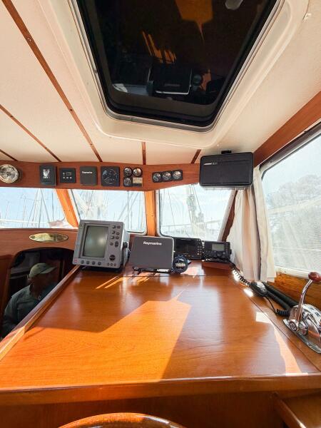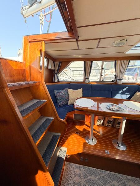 The Nauticat 40 is renowned for its warm teak interior and outstanding pilothouse visibility.