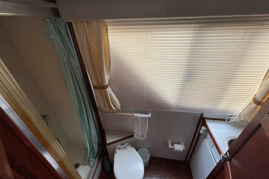 Moving down 2 steps from the Pilothouse area is the master stateroom with an island queen, ample stowage and locker space and an ensuite head complete with shower/tub to port.