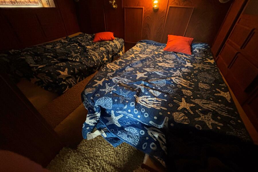 Entering through a sliding door from the covered aft deck and down 5 steps you enter the salon. There is a large sofa (converts to double) to starboard and 2 swivel bucket upholstered chairs to port. Following to port is a breakfast bar with bar stools followed by the galley. Adjacent to the galley is a head with enclosed shower. Just aft of the head and down 2 steps is the guest stateroom which features 2 double beds.