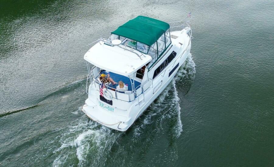 This Mainship 37 Aft Cabin Motor Yacht was a very innovative design when introduced in 1995 with several unique features. Most Motor Yachts in this category have an open front windshield in the cabin but not the Mainship 37. This allows fora very unusual interior configuration with the step down Ga