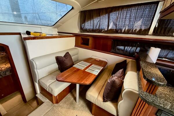 Stepping into the interior, the u-shaped galley is to starboard, with a dinette conveniently located just forward. To port is a large sectional providing ample lounging or entertaining space alongside the dinette seats. Stepping forward of the salon, you'll find the guest/day head to starboard at the base of the steps. The guest cabin is foreward-most, and offers a private shower only accessed via the stateroom. Aft of the galley is the large owner's stateroom, featuring a centerline queen and private head. Ample storage can be found throughout both staterooms via hanging lockers, storage cabinetry, and drawers.