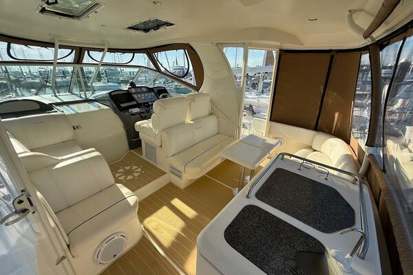 A spacious, fully-enclused cockpit offers protection from the elements when necessary, while opening enclosure panels, side deck doors, and overhead ventilation hatches provide ventilation when conditions are favorable. Comfortable seating can be found throughout the cockpit, from the helm station to lounge seating and the cockpit table.