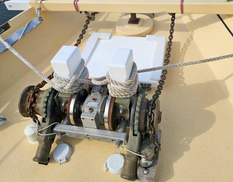 I’m an ardent believer in reliable and versatile ground tackle. I carry five anchors, from a 45 lb spade to a 100 lb Danforth storm anchor. Anchor rodes are 350 ft of 1” plaited Dacron and 200 ft of 3/8” galvanized chain. I trust the pair of 4’ long oak 4x6 Samson posts extending two feet below deck and secured to a watertight bulkhead far more than any deck-fastened cleat. It is far safer and faster to belay a running rode under a load around a vertical post at knee level than a cleat at deck level. But the unique item is the windlass between the posts.