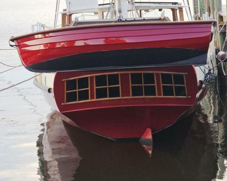 I first saw Tien Hou in the Bahamas one morning in 2004 from the deck of my 32 ft cutter. I had anchored off Staniel Cay as far inshore as I dared with my 5’ draft, since it was a long row to town. Halfway between myself and the beach, I spied a gorgeous ketch. I was gob smacked by her looks; I’d never seen such a striking vessel. My next thought was “ How he’d get in so much shallower in a boat twice as long as mine?”