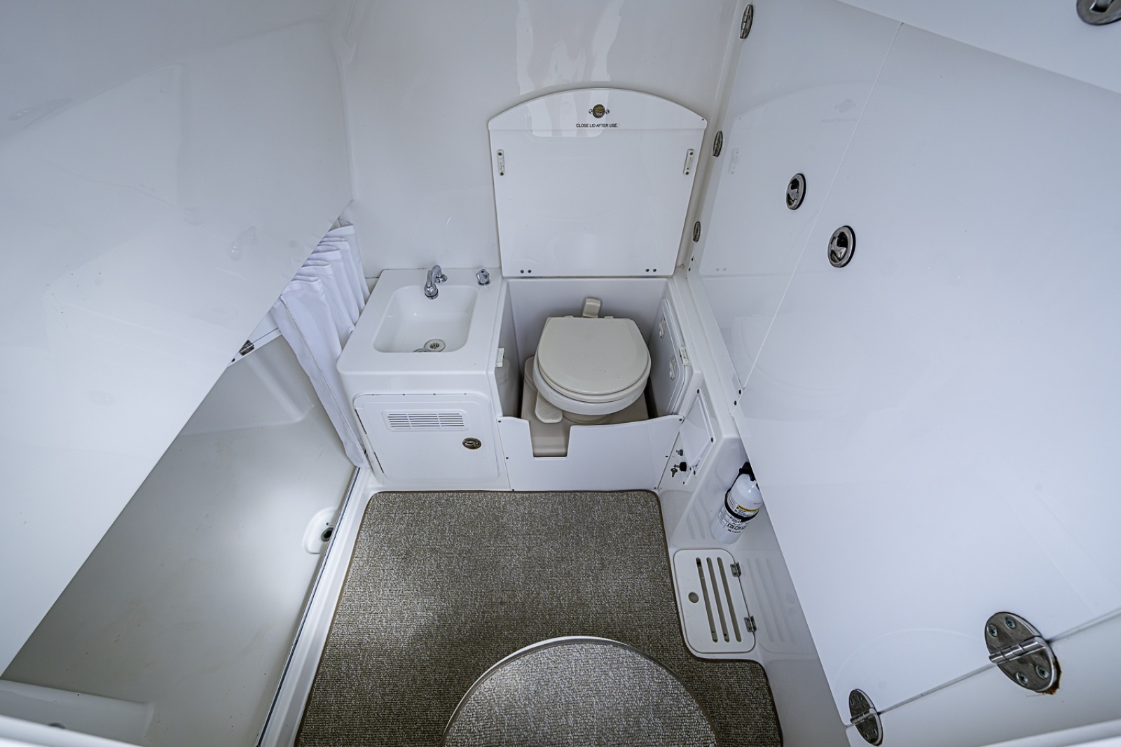For Cruising, there is plush custom seating in the bow and forward of the console, and the electric bow hi/low table also converts to a comfortable, cushioned sun pad. In the stern there are folding seats and. Other comforts include a cabin with berth, sink and china bowl head.
