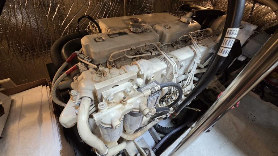 Power aboard Always Friday comes from twin Volvo diesel engines rated at 485 horsepower each, currently showing approximately 1,552 hours on the port engine and 1,560 hours on the starboard engine. These engines provide strong and reliable cruising performance while maintaining efficiency for extended travel.