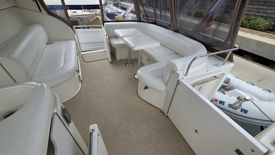 In 2019 the cockpit upholstery and flooring were replaced, giving the space a refreshed and modern appearance. The cockpit is protected by a full canvas top with isinglass enclosure, allowing the area to be enjoyed comfortably in a wide range of weather conditions.