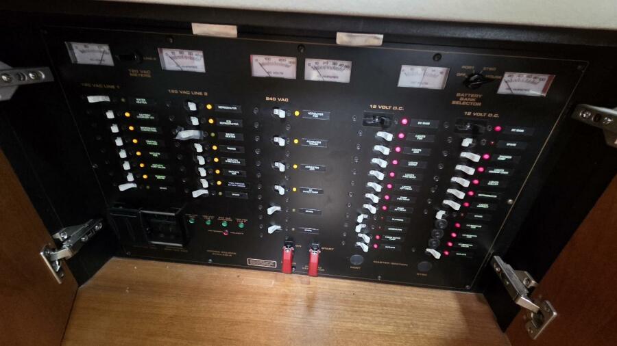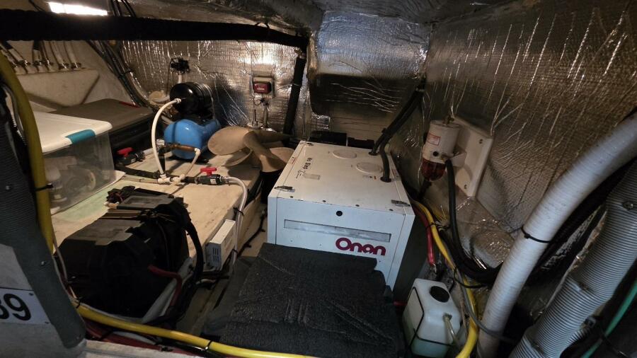 Electrical power away from the dock is supported by an Onan MDKAA 9 kW diesel generator, currently showing approximately 1,366 hours, allowing operation of onboard systems including air conditioning and galley appliances while underway or at anchor.