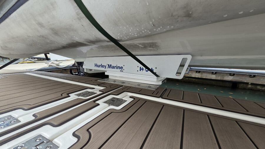 The extended swim platform provides convenient water access and serves as the mounting location for the Hurley Davit System, which supports the vessel’s tender.