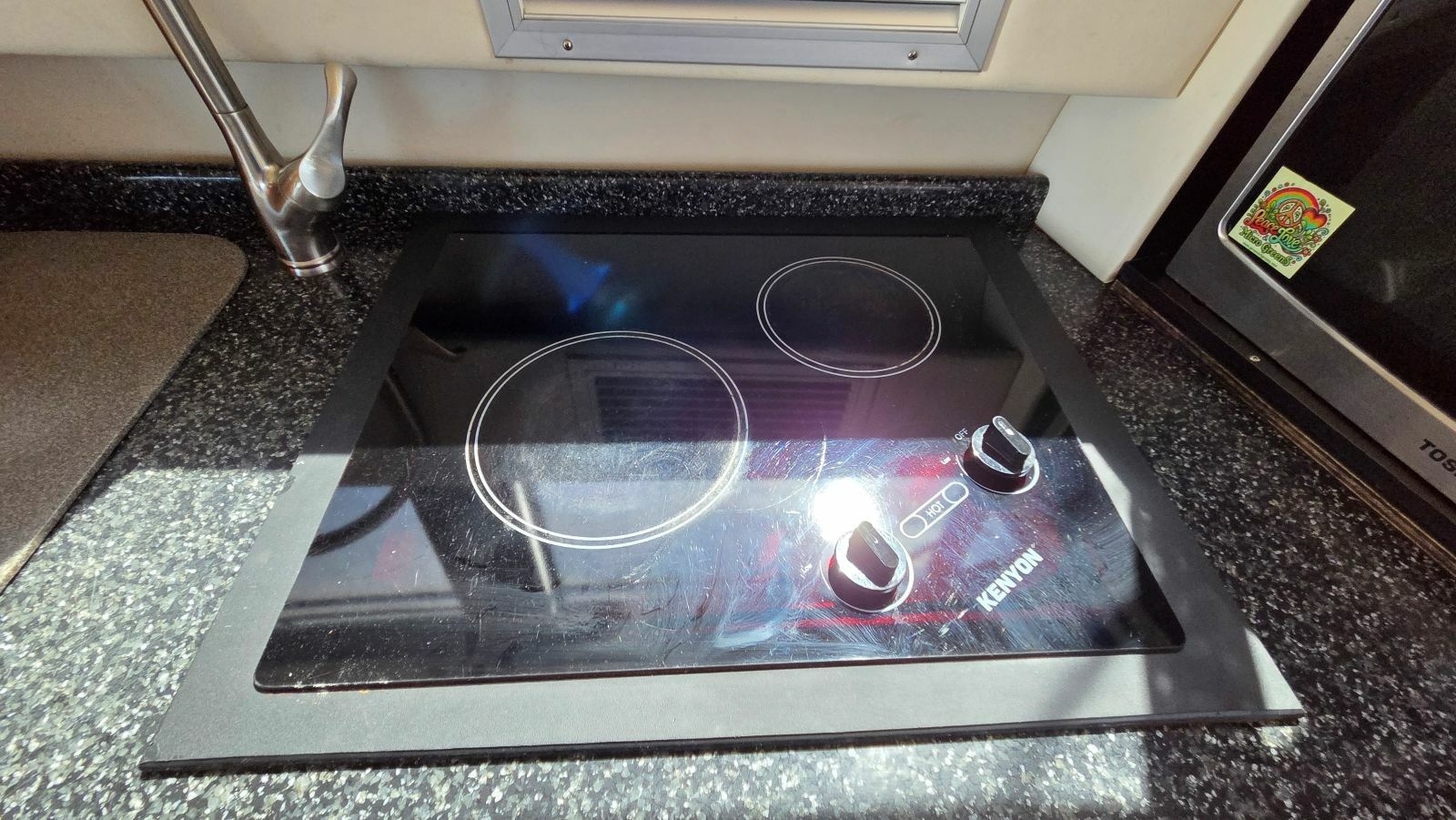 The galley is well integrated into the main living area, making it easy to stay connected while preparing meals. It is equipped with a stand-up Norcold refrigerator/freezer, a 2-burner Kenyon cooktop, a Toshiba microwave oven, and a single basin sink with a pullout faucet. An under-cabinet beverage refrigerator located in the forward portion of the galley adds convenience for entertaining and extended stays aboard, along with a nicely appointed slide-out drawer ideal for provisions or flatware storage.