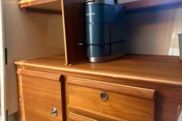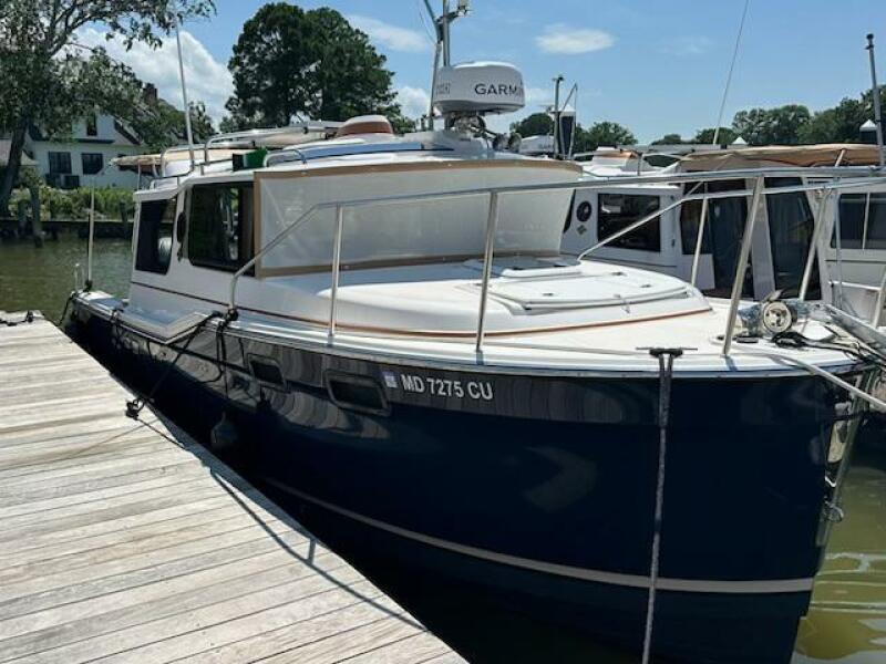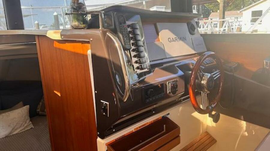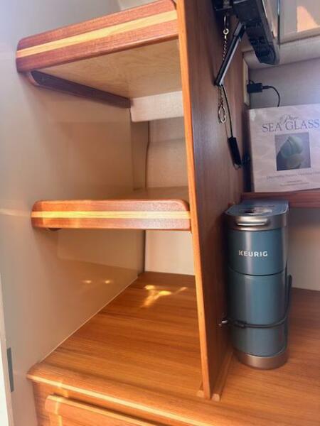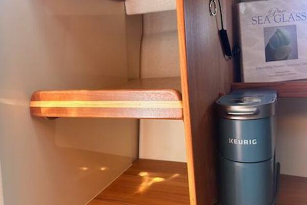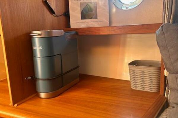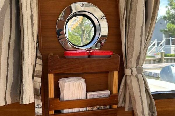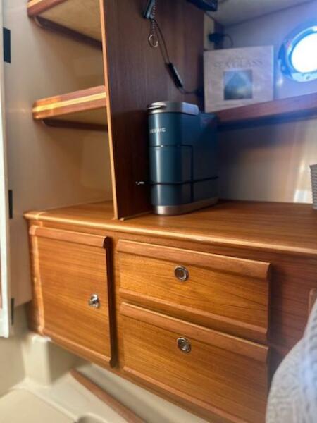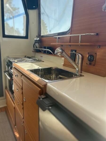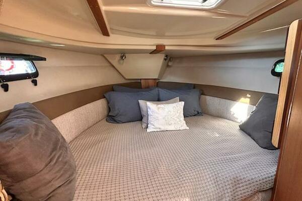 The private forward stateroom has a large queen size bed or can be a U shaped seating area with table for entertaining. Storage lockers and additional custom storage shelves throughout. She has a private head to starboard with a separate shower stall and electric head. The main salon has the helm to starboard with seating to port. The galley is next after on port side and a U shaped dinette to starboard that also converts into a sleeping berth for two. There is also a berth underneath the salon that is perfect for a grandchild or your favorite furry friend. There is reverse cycle heat and air, atrium skylights, 5 opening hatches and 3 portlights for lots of light and ventilation.