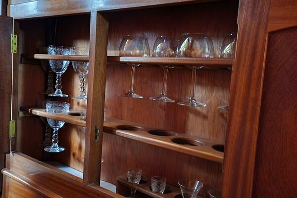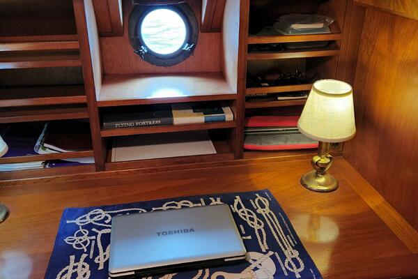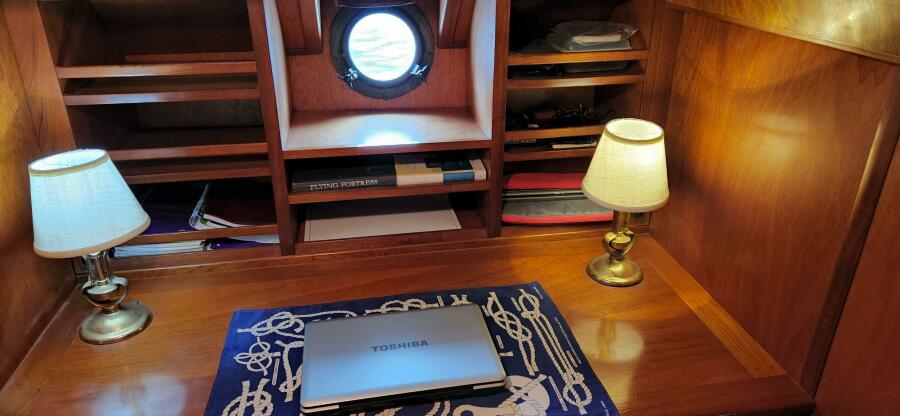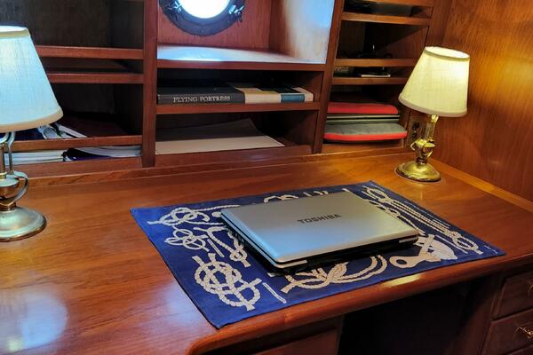 The saloon, forward and stepped down from the pilothouse, is large and comfortable with seating wrapped around a Chinese cherry table. There is a bar in one corner. A 32-inch flat screen is located amid a library area at the aft bulkhead. The sound system has 4 zones and is set up for Sirius/XM radio. The saloon has 6 big windows with blinds and curtains and is very bright.