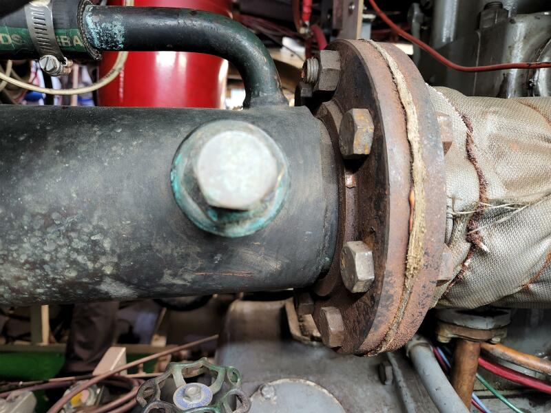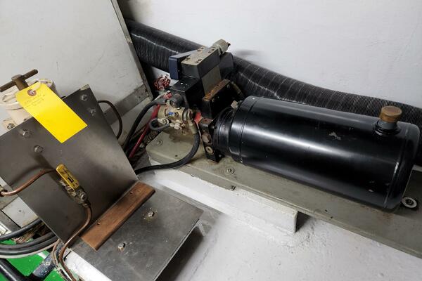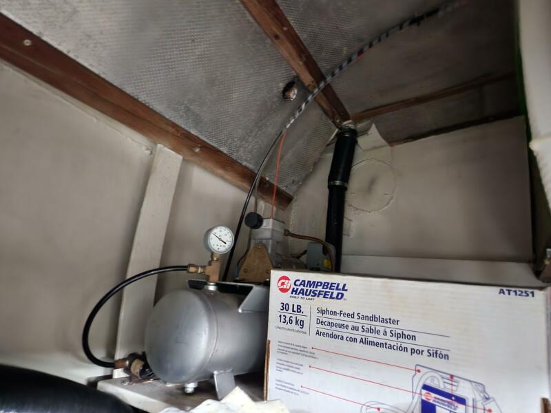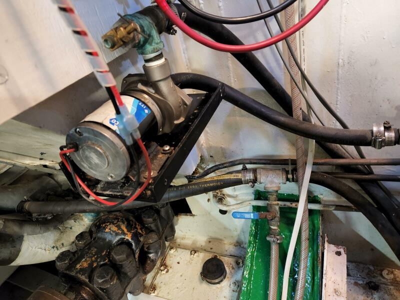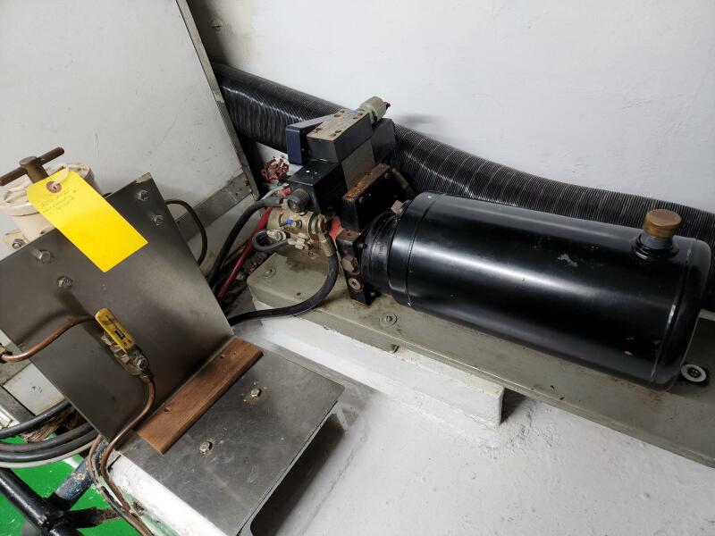 Wesmar 25 HP hydraulic bow thruster. The hydraulic pump is belt-drive by the 4-cylinder Gardner 4L. The hoses run overhead through the engine room and under the floor forward of the engine room. The equipment is solid and reliable. The 4L, unlike the main engine, is noisy. Just like the main engine, the exhaust is dry with a water jacket exhausted out the transom.