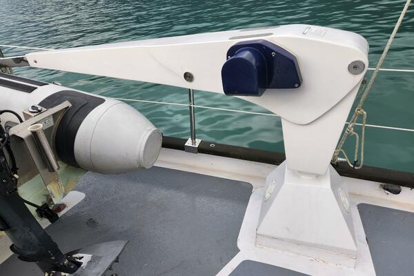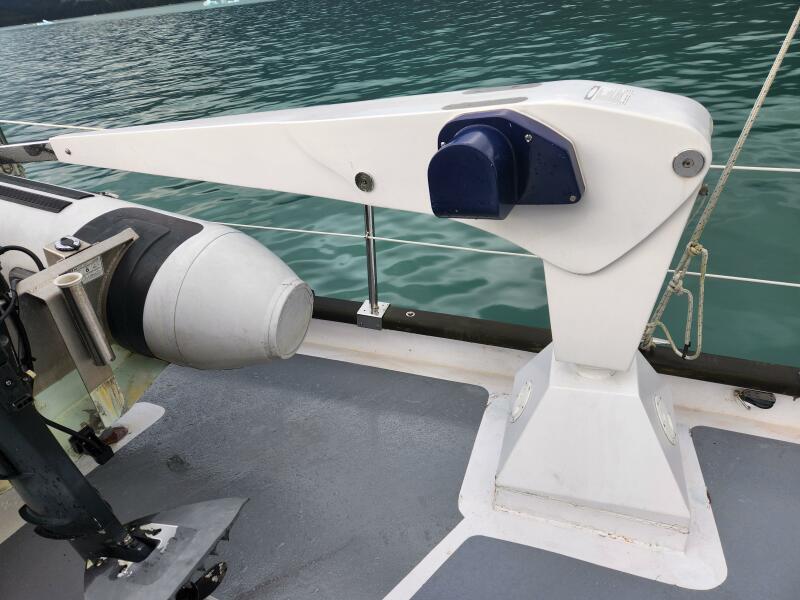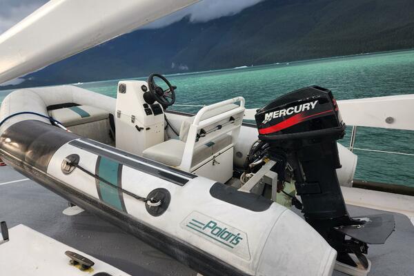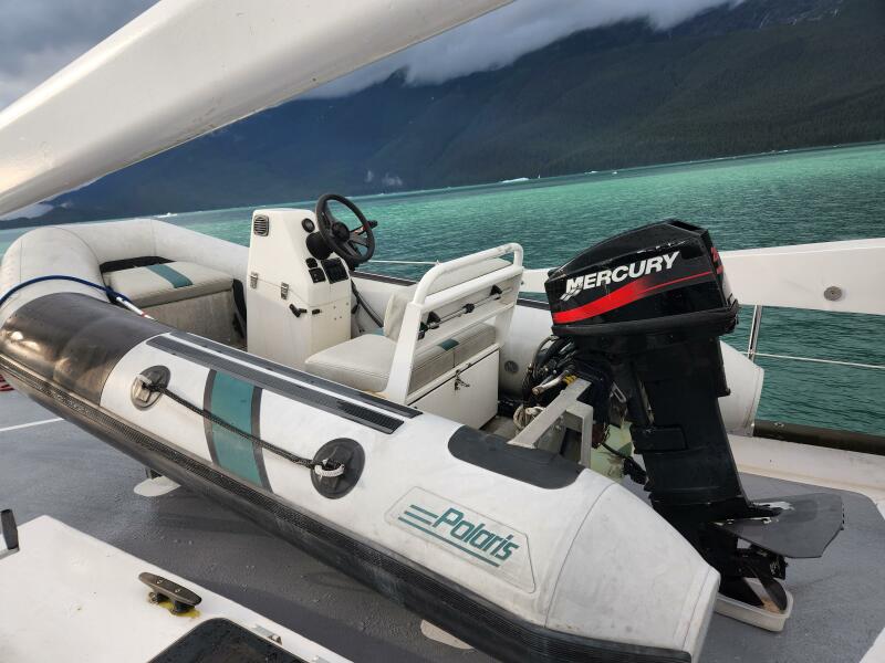 The dinghy is a Canadian built Polaris inflatable with a 25hp Mercury outboard. Polaris builds boats for the Canadian Coast Guard. The boat is stored on the foredeck and easily launched with a Jackson 800# hydraulic/electric crane. The crane has been remounted so it swings easily, and the electric winch has been recently replaced and – this time – protected from the weather.
