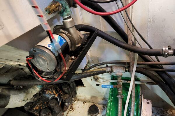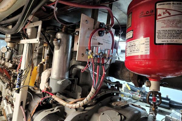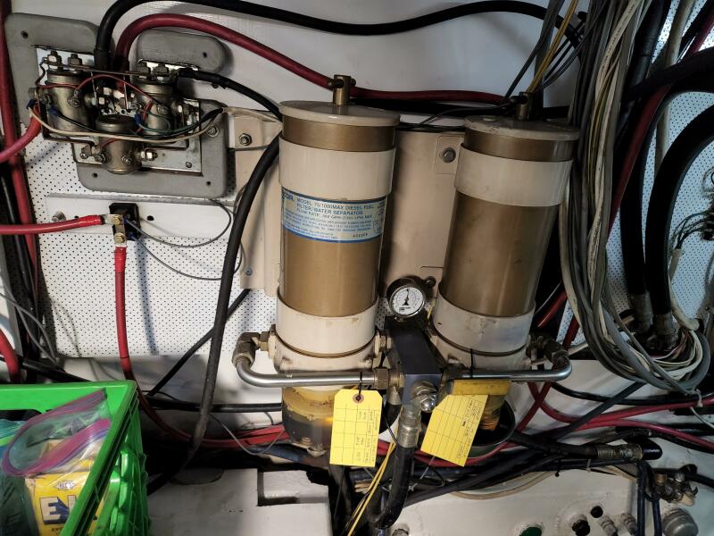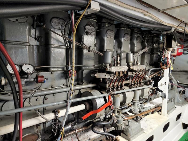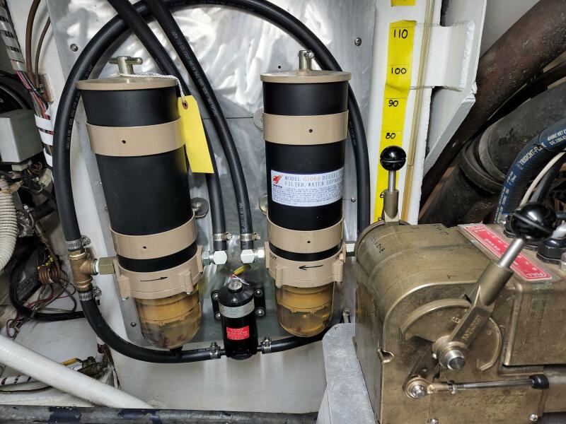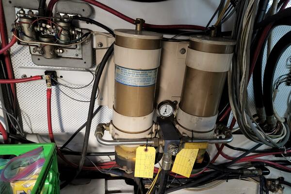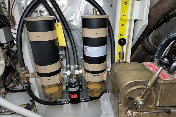Fuel is contained in 5 connected tanks, all located in the engine room. Total capacity is about 1750 gallons. At 7 knots, 2.5 gallons per hour, that's approximately 5,000 nautical miles. Tanks are isolatable with gate valves (recently serviced). Fuel is delivered first to a 150-gallon day tank, pumped through a pair of big Racor-type filters. From the day tank, fuel is pumped through another pair of un-necessarily big Racors to the engine. Oil changes are easy with an electric oil change pump. The big Gardner takes 10 gallons of lube oil.