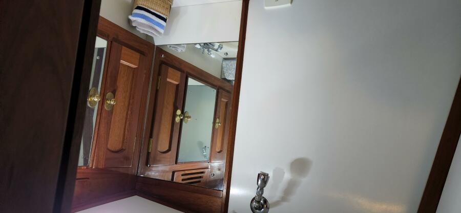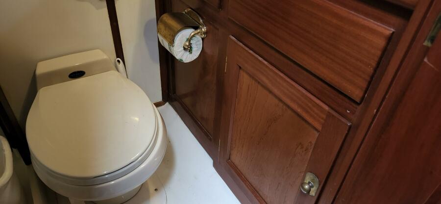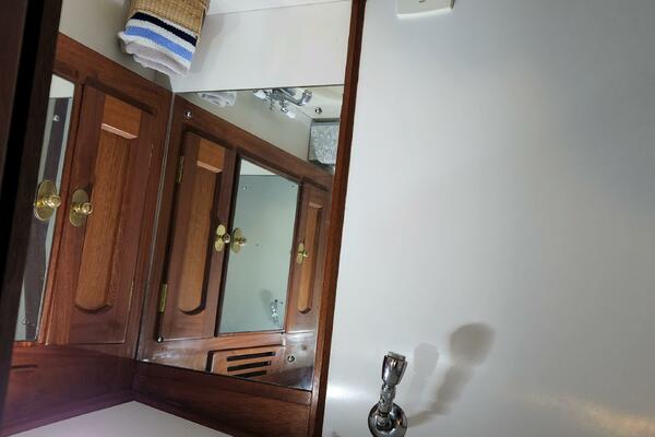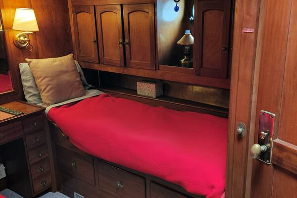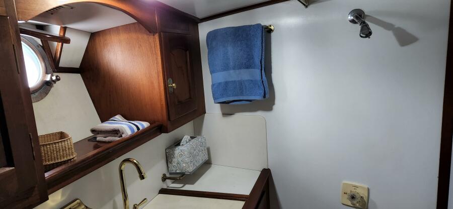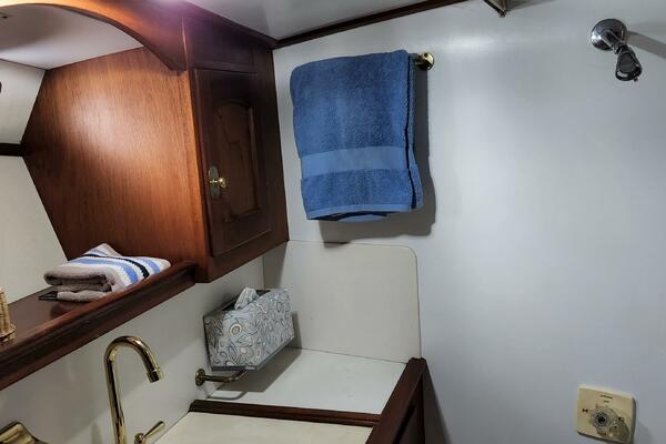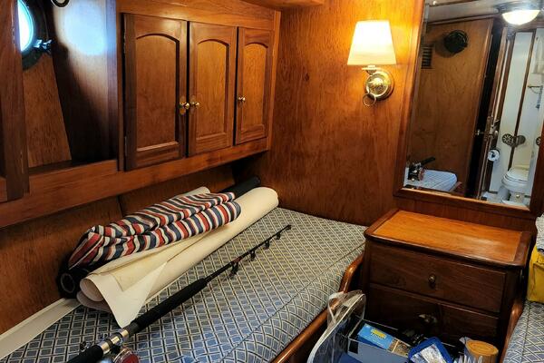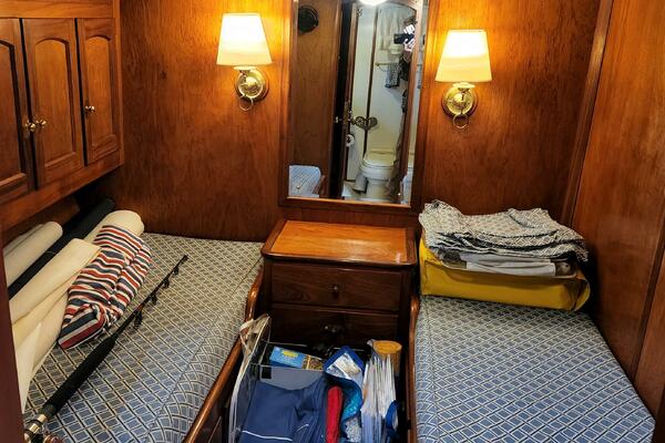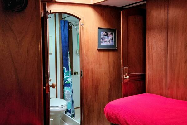 Forward of the galley area, the boat is separated by a heavy watertight door. This bulkhead demarks a separation between owner territory and crew territory. Crew quarters consist of a separate cabin for a captain and a large V-berth for one or two hands. Both these cabins are finished in vesi and feature a full head with sink, toilet, and shower.