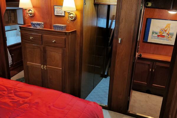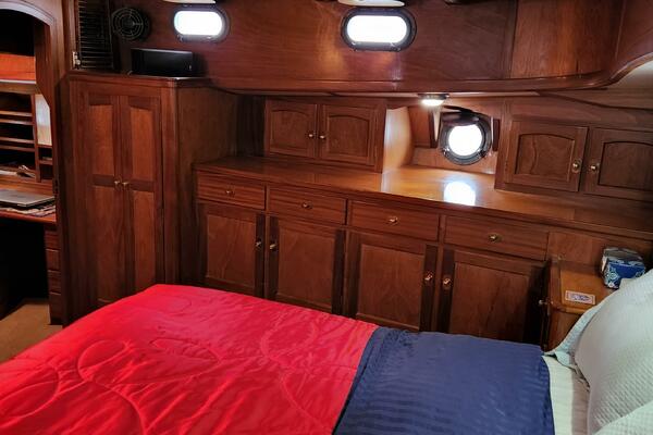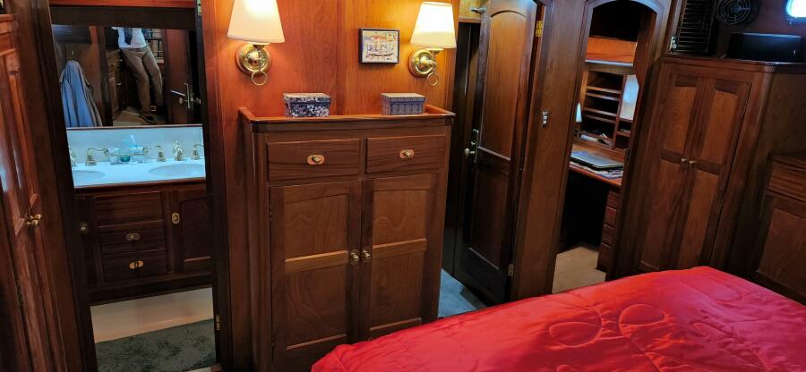 The gorgeous owner's cabin is aft, full width of the hull so it easily accommodates the centerline, standard queen size bed. Aft of the saloon and beneath the sundeck, it offers excellent privacy. There are twin closets and lots of built-in cabinetry. Port-side is a head with twin lavatories, Master flush toilet, shower and a tub. Starboard-side is an office with built- in desk and swinging lamps.