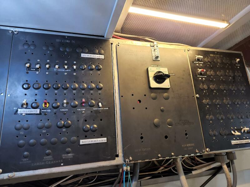 All lighting is LED now, and the lighting electric load is tiny. Most of the boat has been re-wired, modernizing circuits and changing cable to modern marine grade wire. Shore power is hard-wired. Isolation transformers supply both 110 and 220 voltages.