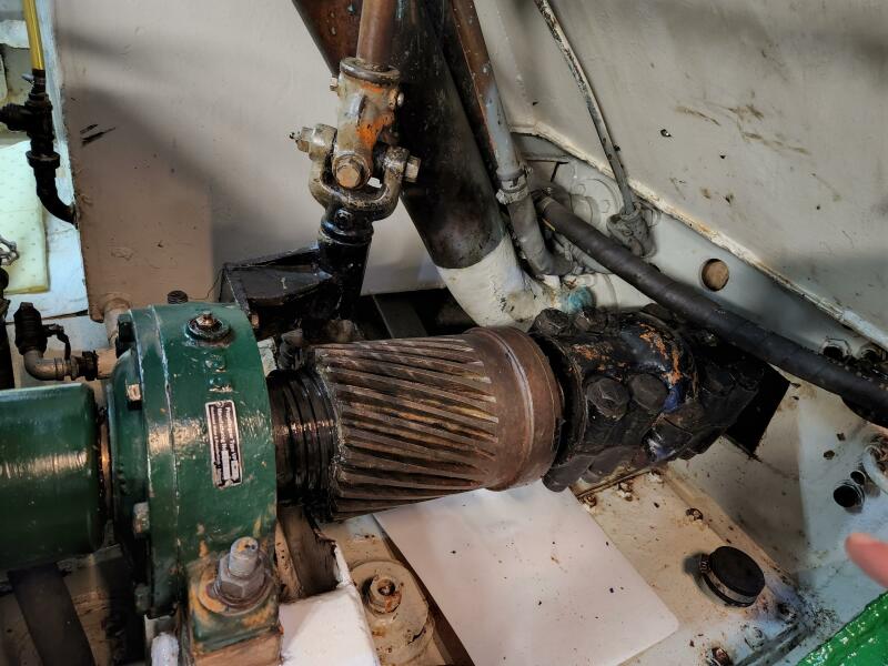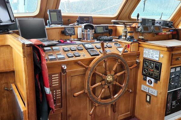Currently, there is a single steering station in the pilothouse. We usually steer with the autopilot, a Simrad AP20 with an electronic heading reference driving a pair of AccuSteer reversible pumps. The pumps are redundant and can be run singly or together. We find one is quite adequate. It is also possible to switch the steering to a joystick system for manual control without leaving the pilothouse seating bench. There is also a classic spoked wheel driving a Robertson hydraulic pump.