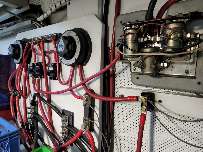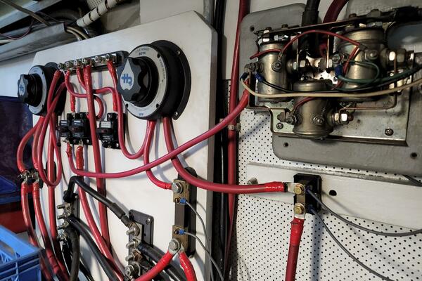 Havfruen runs on 4 electric systems: 12 and 24 volt DC, 110 and 220 volt AC. The primary power is 24 volt delivered from a bank of 8 lead-acid batteries located forward in the engine room. The anchor windlass is powered by its own bank of 2 batteries located in a V-berth locker, and the big electric sheet winches run on a bank of 2 batteries located in the aft lazarette. All the batteries are charged with an 80 amp Charles 3-stage, 220v charger or with the 150 amp alternator running off the 8L3B which charges only the main bank. There are 2 large solar panels on the roof. They are a significant source of amps in Mexico.