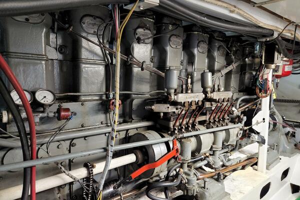 The engine is huge (7,000 pounds) but delivers just 200 HP at a max rpm of 1200. It idles at 300 RPM and is usually run at around 750. By today's standards it is pretty unsophisticated – no turbo, no emission controls, no electronics. This engine is generally regarded as good for 20,000 hours to rebuild time. The engine is very quiet (because of the super heavy case and low RPM).