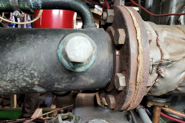 Engine cooling is a keel cooler system using anti-freeze. The keel cooler is a triangular channel integrated along the hull. It's located along where the round part of the hull meets the vertical wall of the wide keel. A surge tank shows the head of the anti-freeze.