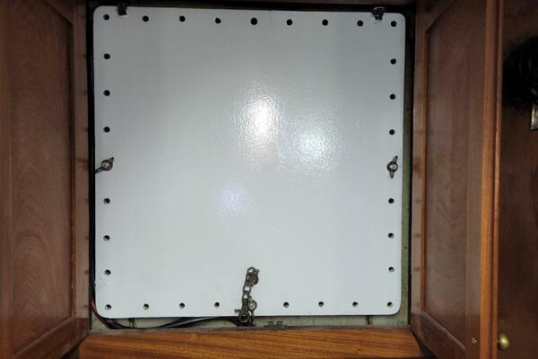 Forward of the V-berth is the anchor locker. The locker is contained behind a heavy steel door, bolted to the bulkhead. Forward bulkhead is designed to be a crash-proof bulkhead. Much of the steel at the prow of the boat appears to be stainless.