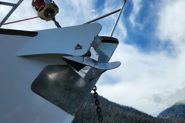 For a main anchor, Havfruen carries a 200# Danforth on 350 feet of 5/8 BBB chain on the port side. The starboard anchor is a 60# SS articulated plow “lunch hook” on 400 feet of 3/8 BBB.