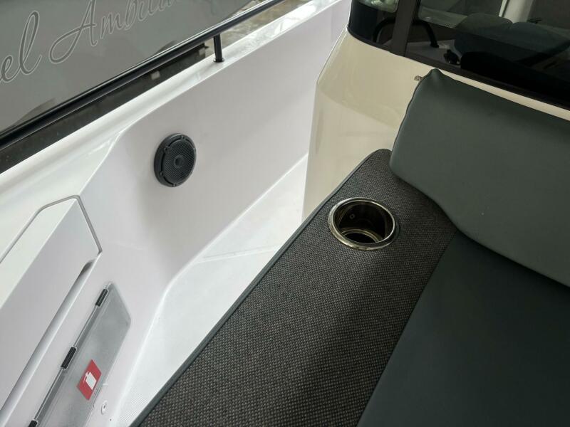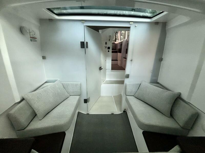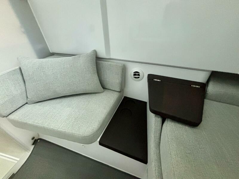 Descending through the sliding cabin door, the forward cabin offers a comfortable and private retreat for overnight stays. A large queen-size berth with soft side bolsters and premium upholstery creates a cozy sleeping space for two, while skylights and portlights provide natural light and ventilation. Storage cabinets, foldable shelves, and clever hanging solutions maximize the use of space. Integrated LED lighting, USB charging outlets, and climate control ensure modern comfort whether spending a weekend aboard or enjoying longer coastal adventures.