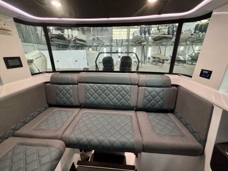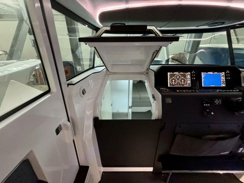 Stepping forward into the fully enclosed pilothouse, the Axopar 37 XC immediately showcases its innovative Scandinavian design. Large wraparound windows and curved glass windscreens provide excellent visibility and natural light, creating a bright and airy space for cruising in any weather. Rotating helm seats with flip-up bolsters allow the captain and companion to sit comfortably while underway or swivel toward the cockpit table to create a social lounge. A spacious L-shaped sofa and foldable cockpit table transform the pilothouse into an inviting dining and entertaining area, complemented by LED lighting, convenient storage compartments, and premium finishes throughout.