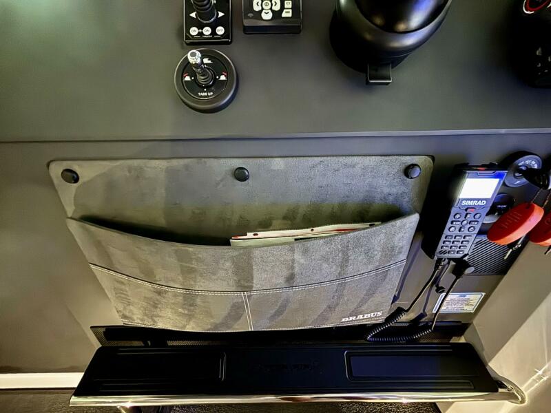 At the helm, the Axopar’s clean, modern dashboard places all navigation and vessel controls within easy reach. Dual Simrad multifunction displays, radar integration, bow thruster control, and digital switching systems provide advanced navigation and vessel management. Stainless steel footrests, leather grab rails, and a thoughtfully designed control console enhance comfort and ergonomics during long passages. The large sliding sunroof above allows fresh air and sunlight into the pilothouse, while the enclosed cabin design keeps the space protected during rough weather or cooler cruising conditions.