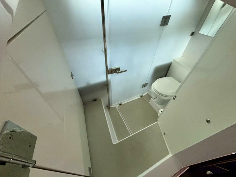 The forward cabin also houses a well-designed head compartment, featuring an electric flush toilet with holding tank, sink, mirror, and practical storage. Thoughtful design elements such as LED lighting, ventilation hatches, and quality fixtures ensure the space remains bright and functional.